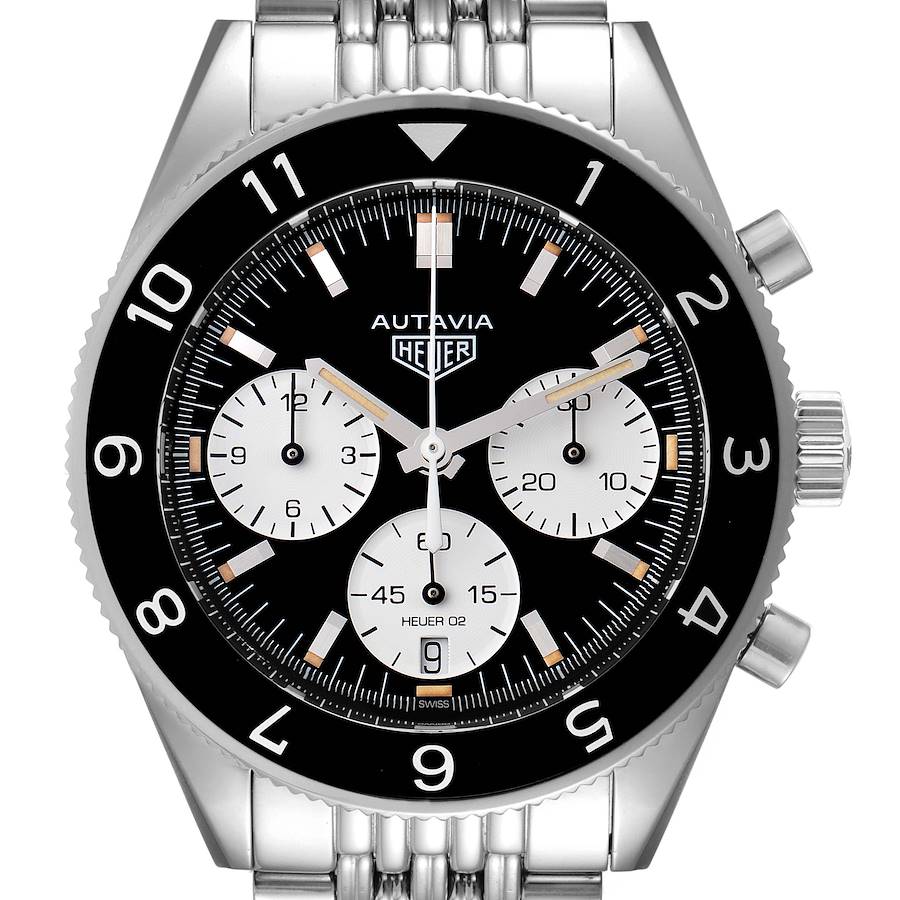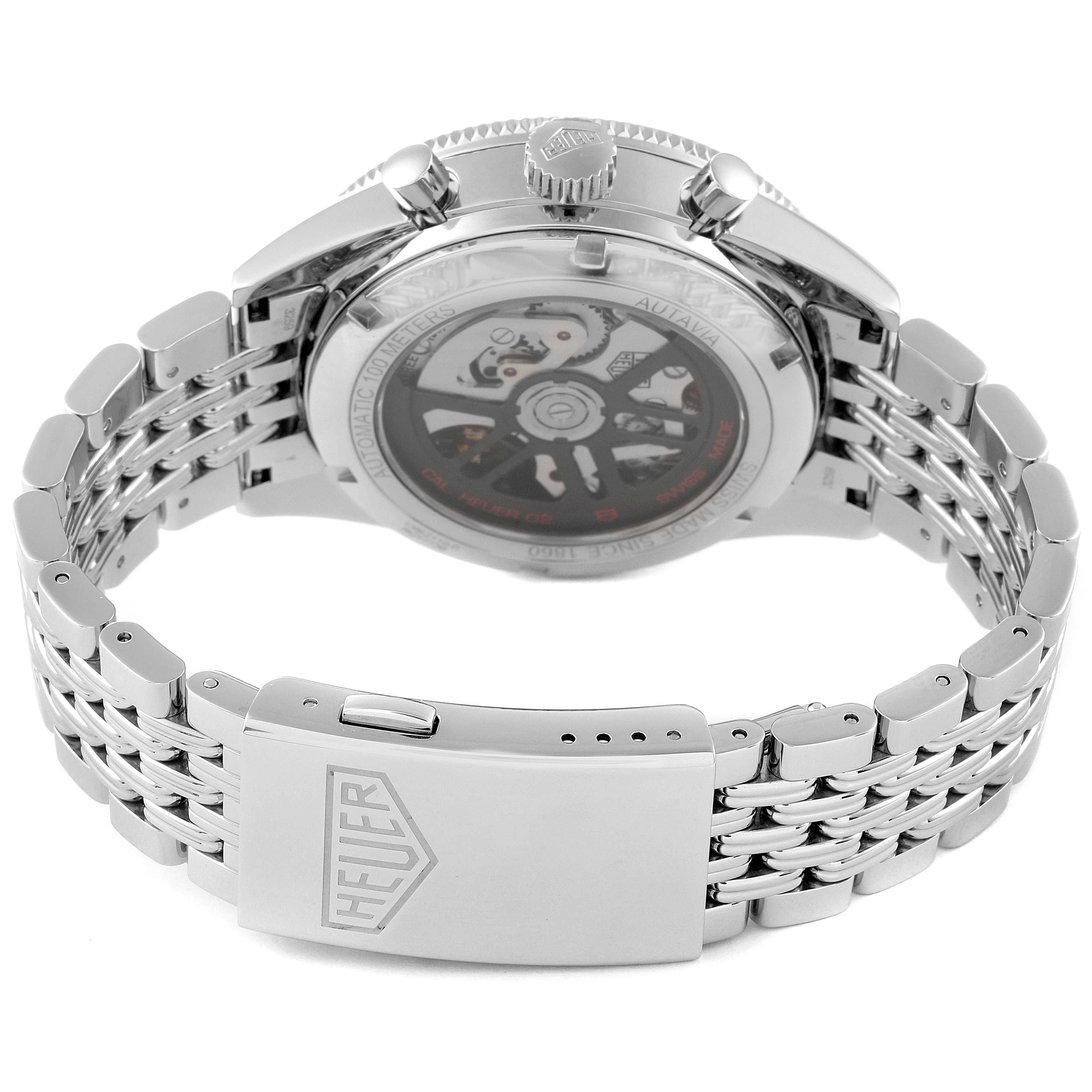 Tag Heuer Autavia Heritage Steel Mens Watch CBE2110 Box Card. Automatic self-winding chronograph movement. Stainless steel case 42 mm in diameter. Exhibition sapphire crystal case back. Black aluminum bi-directional bezel with 12 silvered hour graduations. Scratch resistant sapphire crystal. Black dial with raised baton hour markers. Three silver chronograph sub-dials -- 60 second, 30 minute and 12 hours. Stainless steel bracelet with folding push button deployant clasp. Fits 7 3/4" wrist.