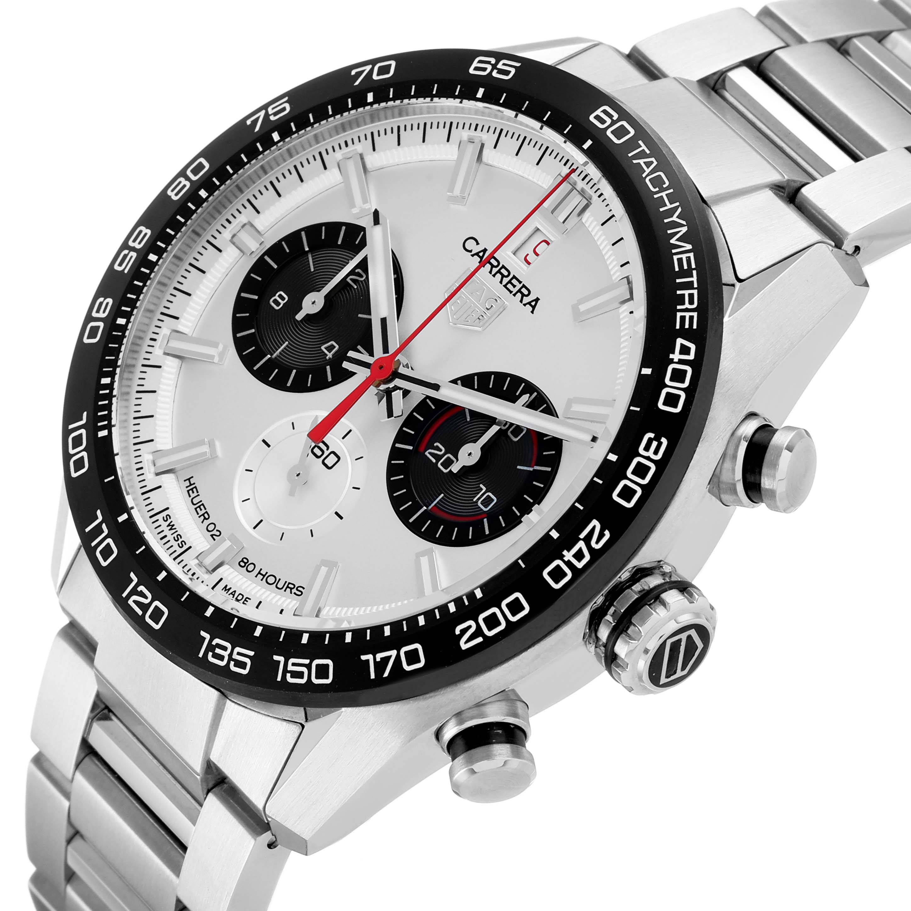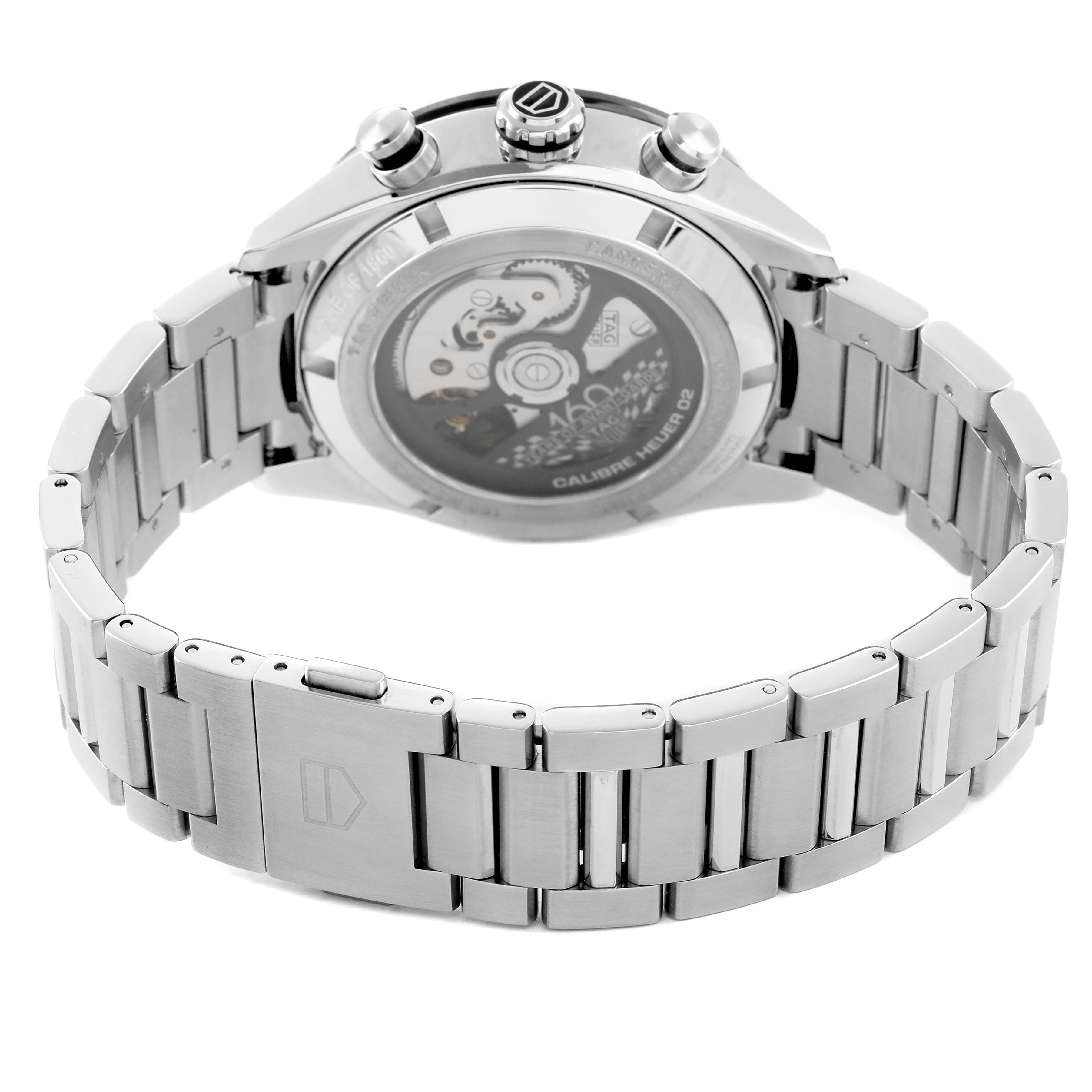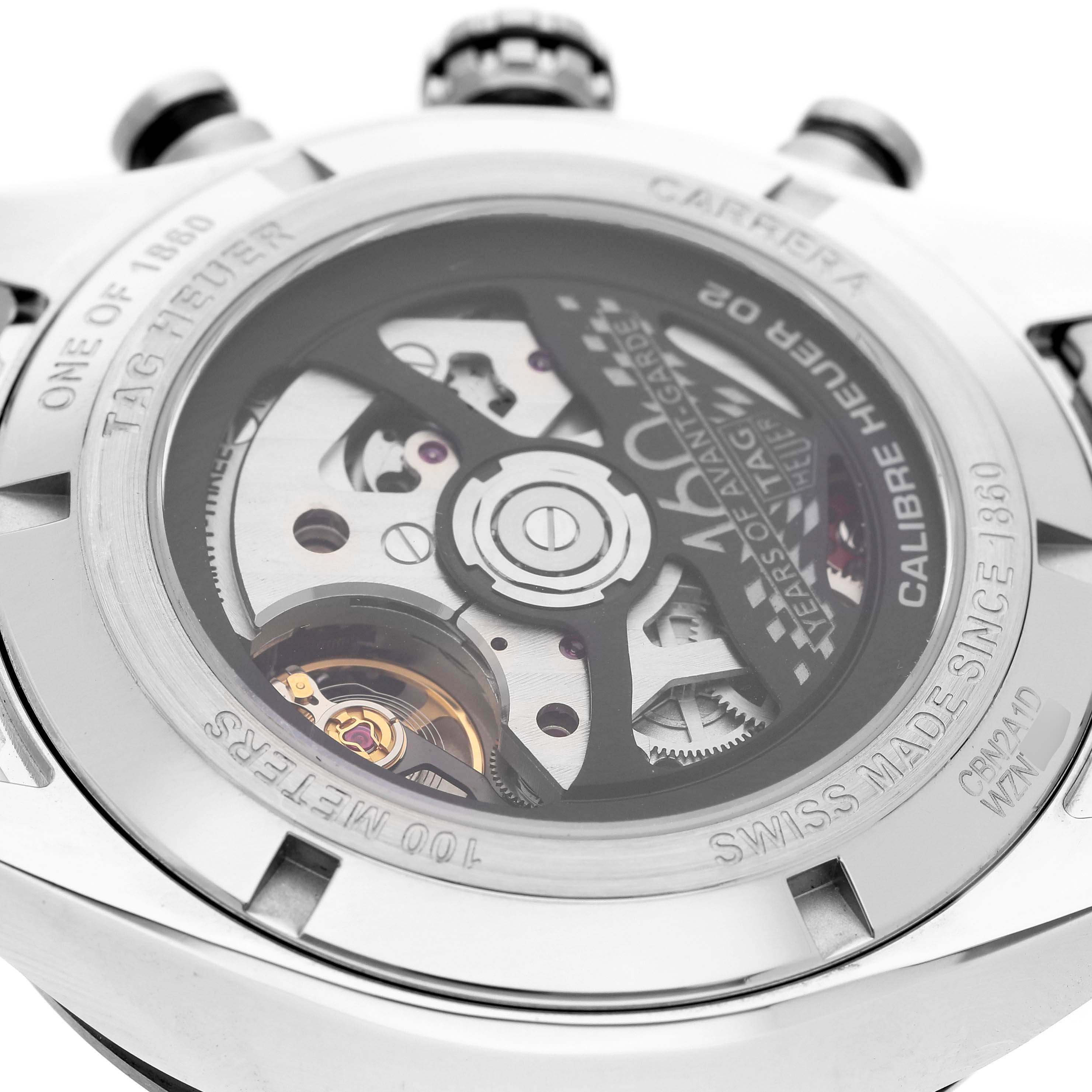 Tag Heuer Carrera Anniversary LE Steel Silver Dial Mens Watch CBN2A1D Box Card. Automatic self-winding chronograph movement. Stainless steel round case 44.0 mm in diameter. Transperent exhibition sapphire crystal case back. Two pushers operate the chronograph functions. Tag Heuer logo on the crown. Black ceramic bezel with the tachymeter scale. Scratch resistant sapphire crystal. Silver dial with luminescent index hour markers and hands. Three subdials -- running seconds and the 30-minute and 12-hour chronograph registers. Date calendar at the 12 o'clock aperture. Stainless steel bracelet with a double push-button deployant clasp. Fits an 8 1/2" wrist.