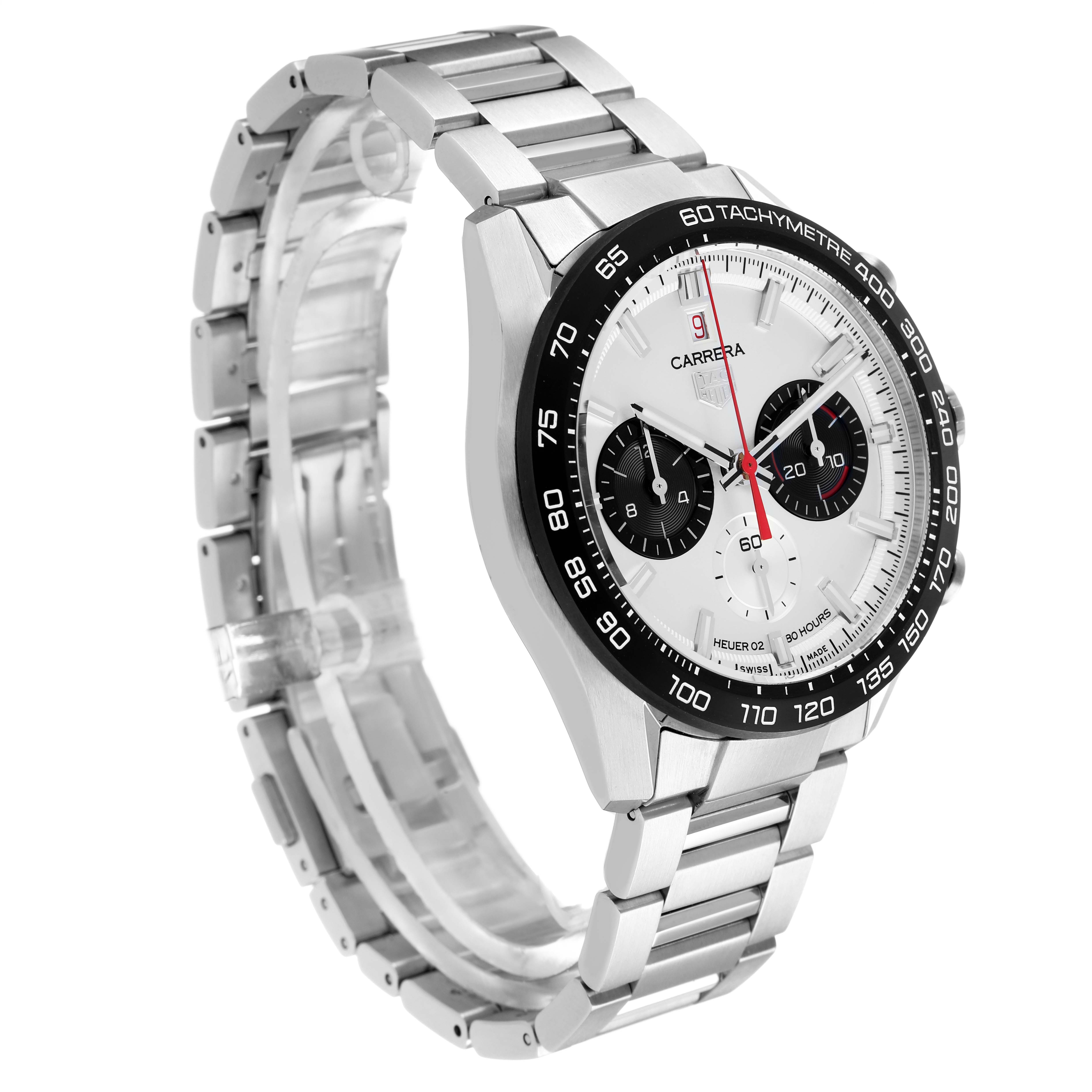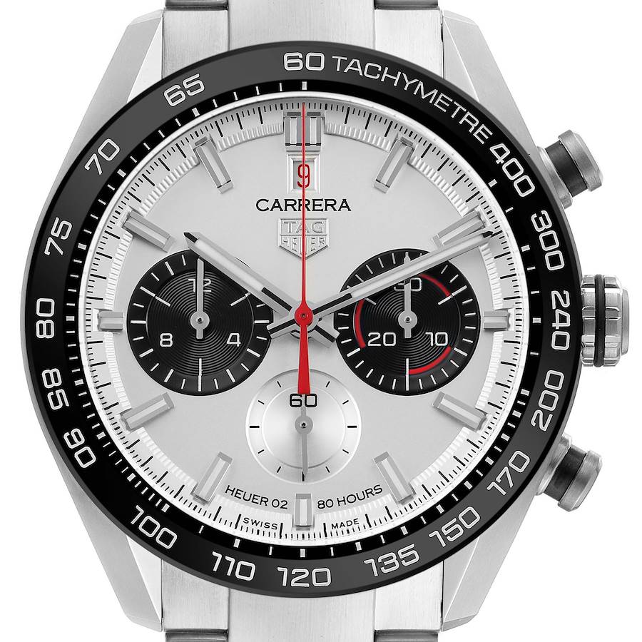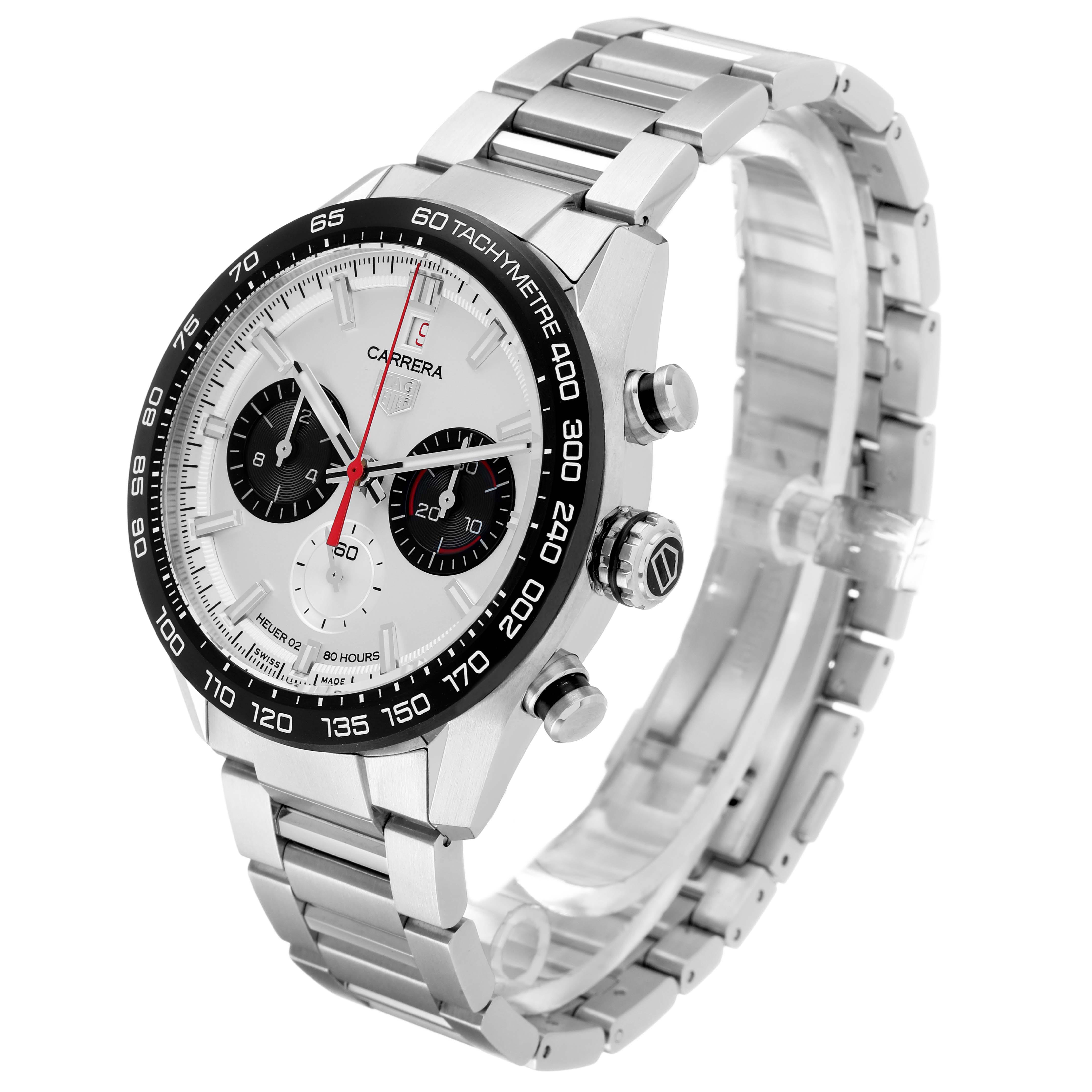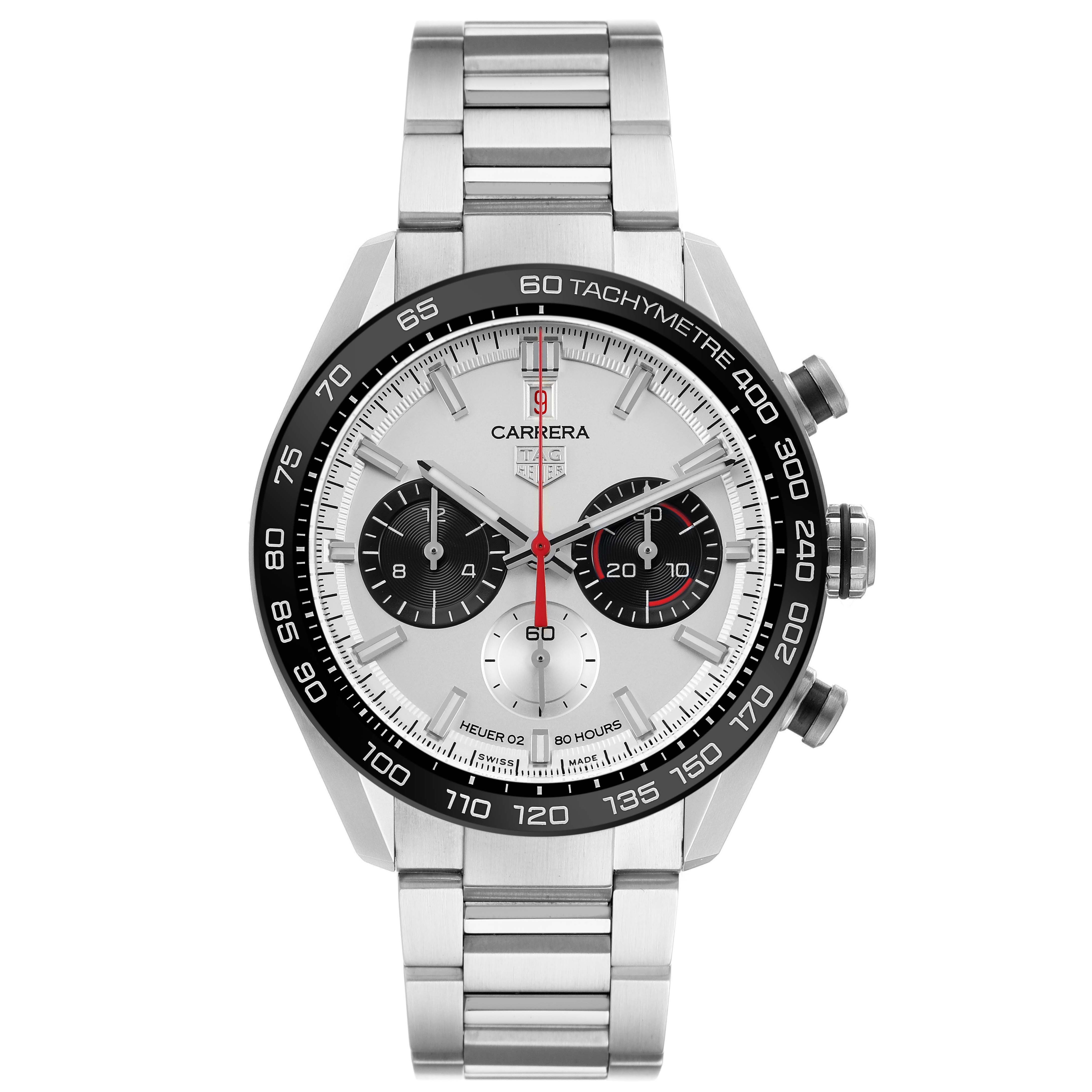 Tag Heuer Carrera Anniversary LE Steel Silver Dial Mens Watch CBN2A1D Box Card. Automatic self-winding chronograph movement. Stainless steel round case 44.0 mm in diameter. Transperent exhibition sapphire crystal case back. Two pushers operate the chronograph functions. Tag Heuer logo on the crown. Black ceramic bezel with the tachymeter scale. Scratch resistant sapphire crystal. Silver dial with luminescent index hour markers and hands. Three subdials -- running seconds and the 30-minute and 12-hour chronograph registers. Date calendar at the 12 o'clock aperture. Stainless steel bracelet with a double push-button deployant clasp. Fits an 8 1/2" wrist.