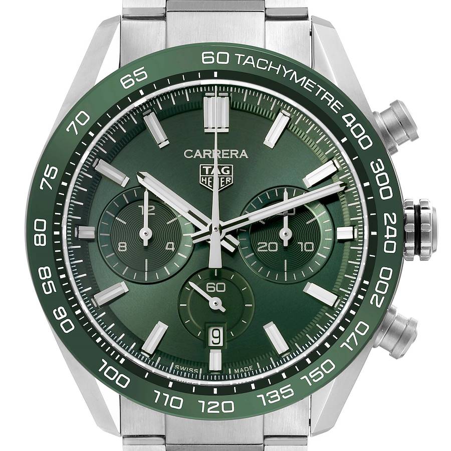 Tag Heuer Carrera Chronograph Green Dial Steel Mens Watch CBN2A1N Box Card. Automatic self-winding chronograph movement. Stainless steel round case 44.0 mm in diameter. Transparent exhibition sapphire crystal caseback. Two pushers operate the chronograph functions. Tag Heuer logo on the crown. Green ceramic tachymeter scale bezel. Scratch resistant sapphire crystal. Green dial with luminescent baton hour markers and hands. Three chronograph subdials -- running seconds and the 30-minute and 12-hour chronograph registers. Date window at 6 oclock. Stainless steel bracelet with a double push-button deployant clasp. Fits up to an 8.5" wrist.