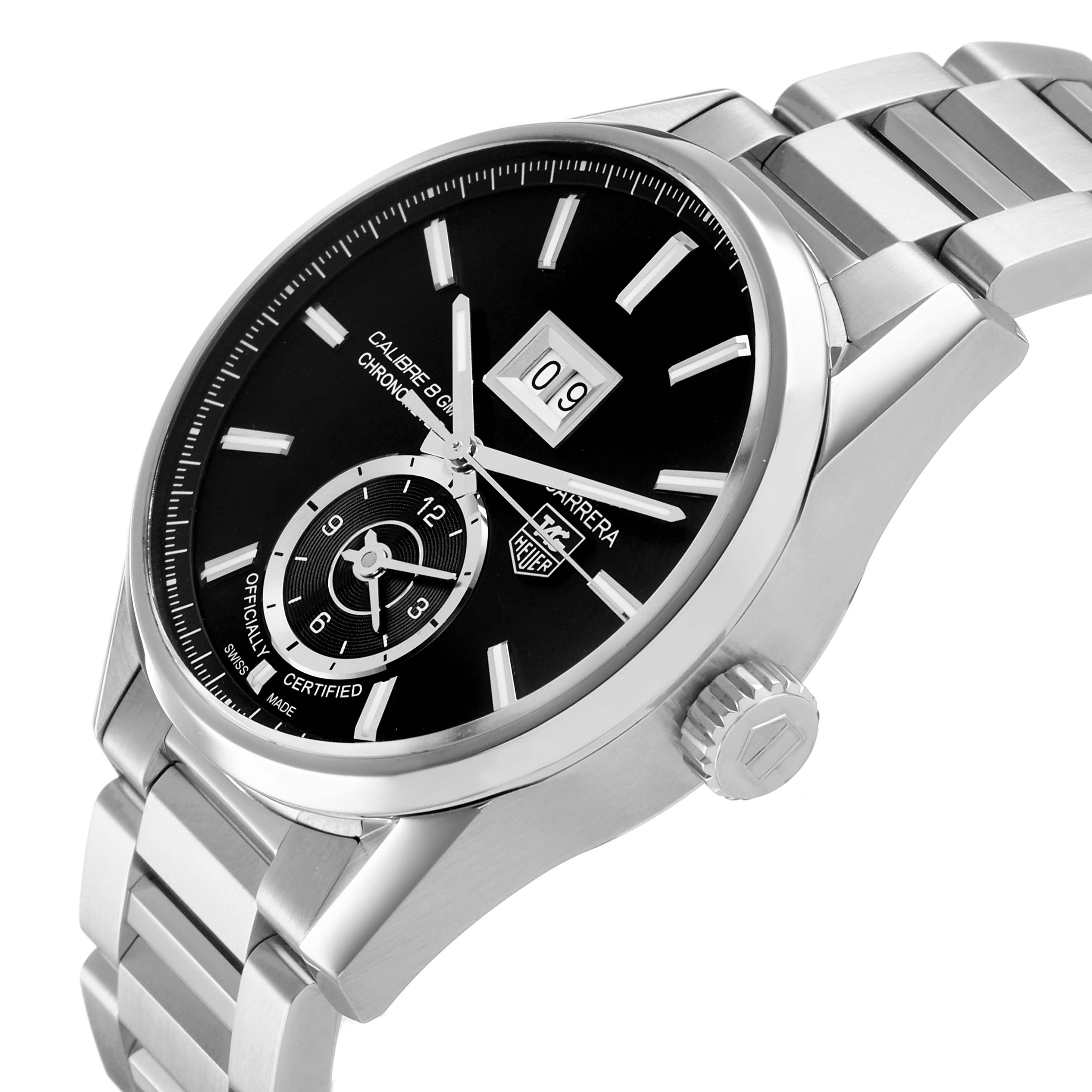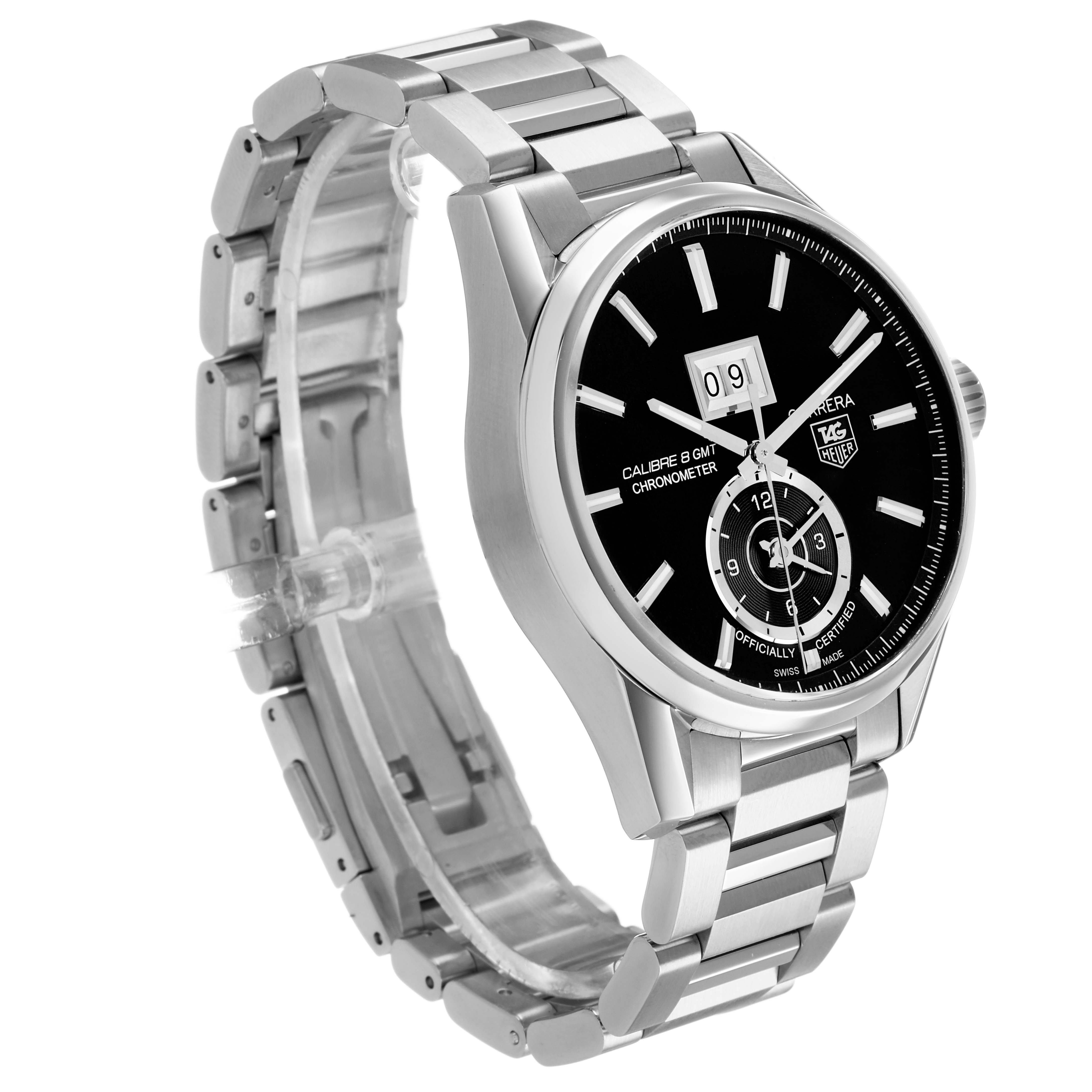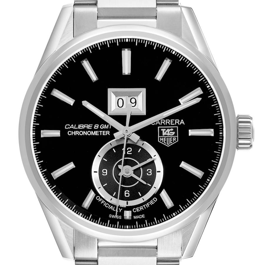 Tag Heuer Carrera GMT Steel Black Dial Mens Watch WAR5010 Box Card. Automatic self-winding movement. Polished stainless steel case 41.0 mm. Transperent sapphire crystal back. Stainless steel bezel. Scratch resistant sapphire crystal. Black dial with index hour markers. Luminous hands and hour markers. Date display below the 12 o'clock. 12 hour (GMT) sub-dial at the 6 o'clock. Stainless steel bracelet with hidden folding push button deployant clasp. Fits a 7 3/4" wrist.