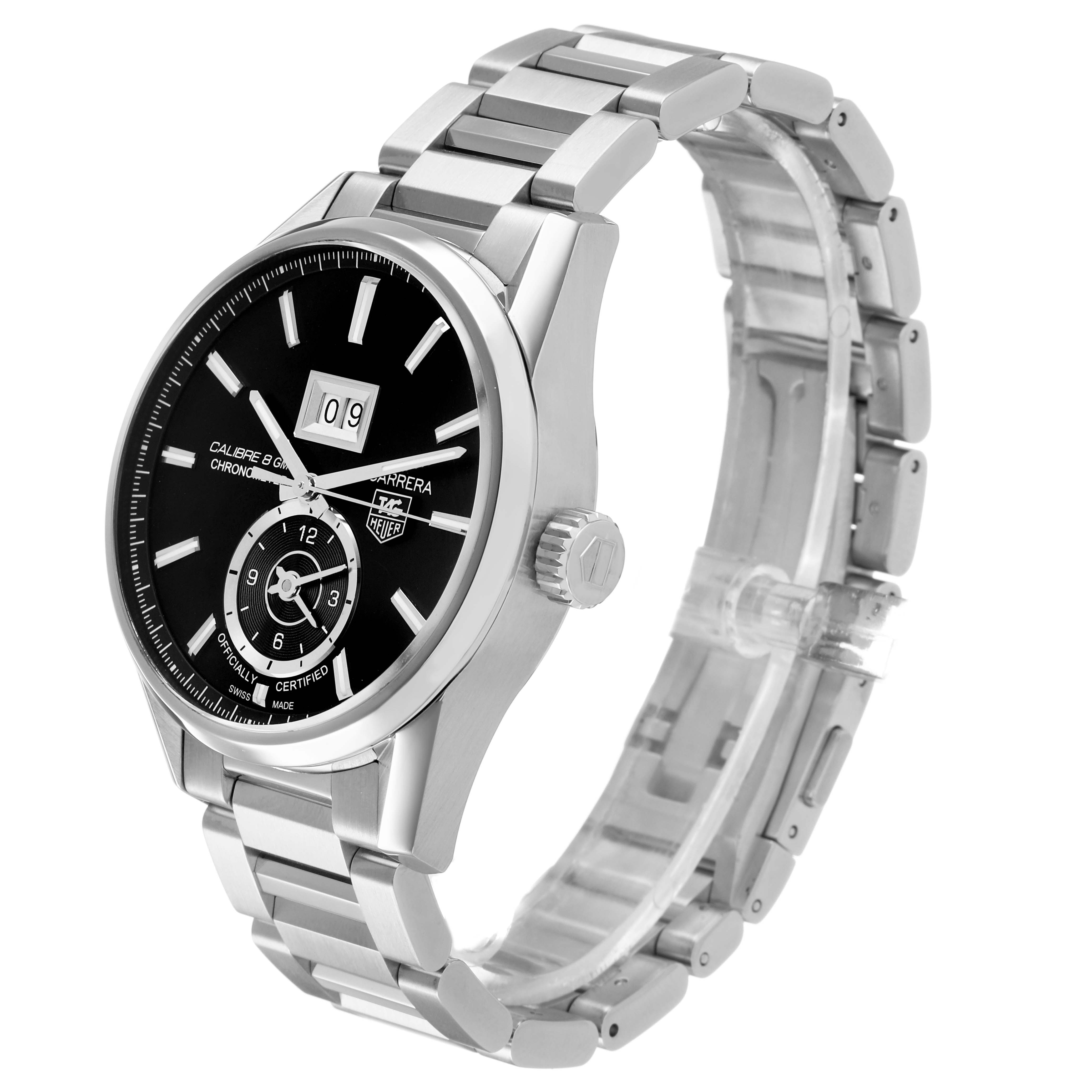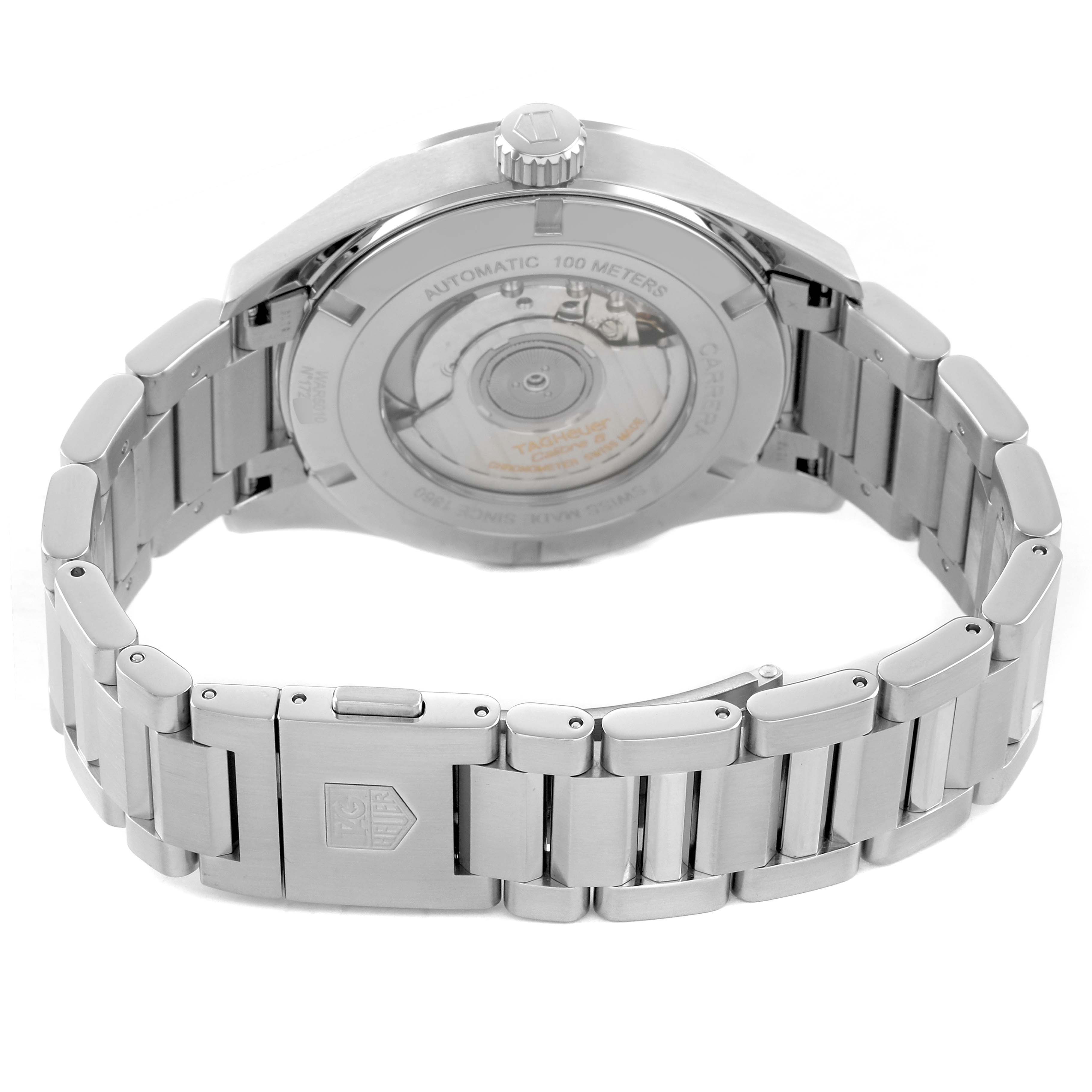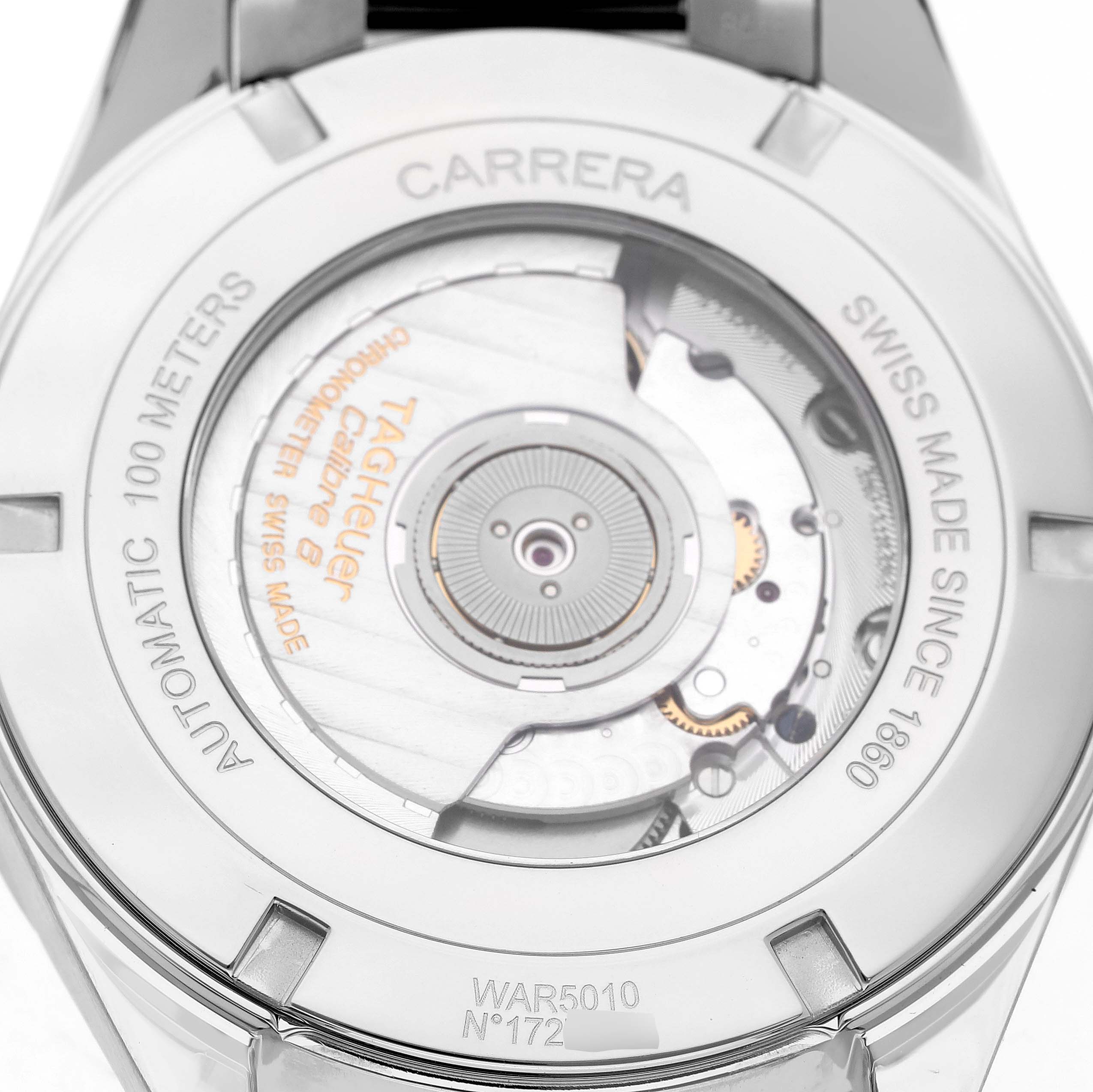 Tag Heuer Carrera GMT Steel Black Dial Mens Watch WAR5010 Box Card. Automatic self-winding movement. Polished stainless steel case 41.0 mm. Transperent sapphire crystal back. Stainless steel bezel. Scratch resistant sapphire crystal. Black dial with index hour markers. Luminous hands and hour markers. Date display below the 12 o'clock. 12 hour (GMT) sub-dial at the 6 o'clock. Stainless steel bracelet with hidden folding push button deployant clasp. Fits a 7 3/4" wrist.
