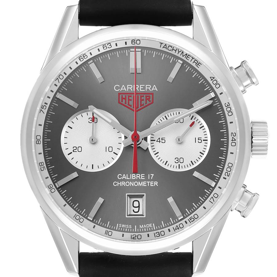 Tag Heuer Carrera Heritage Chronograph Steel Gray Dial Watch CV5110 Box Card. Automatic self-winding chronograph movement. Stainless steel case 41.0 mm. Tag Heuer logo on a crown. Stainless steel smooth bezel. Scratch resistant sapphire crystal. Gray dial with raised baton hour markers. Small seconds at 3. Chronograph 30 min sub dial at 9 o'clock. Date window at 6. Black rubber strap with stainless steel double push-button deployant clasp.