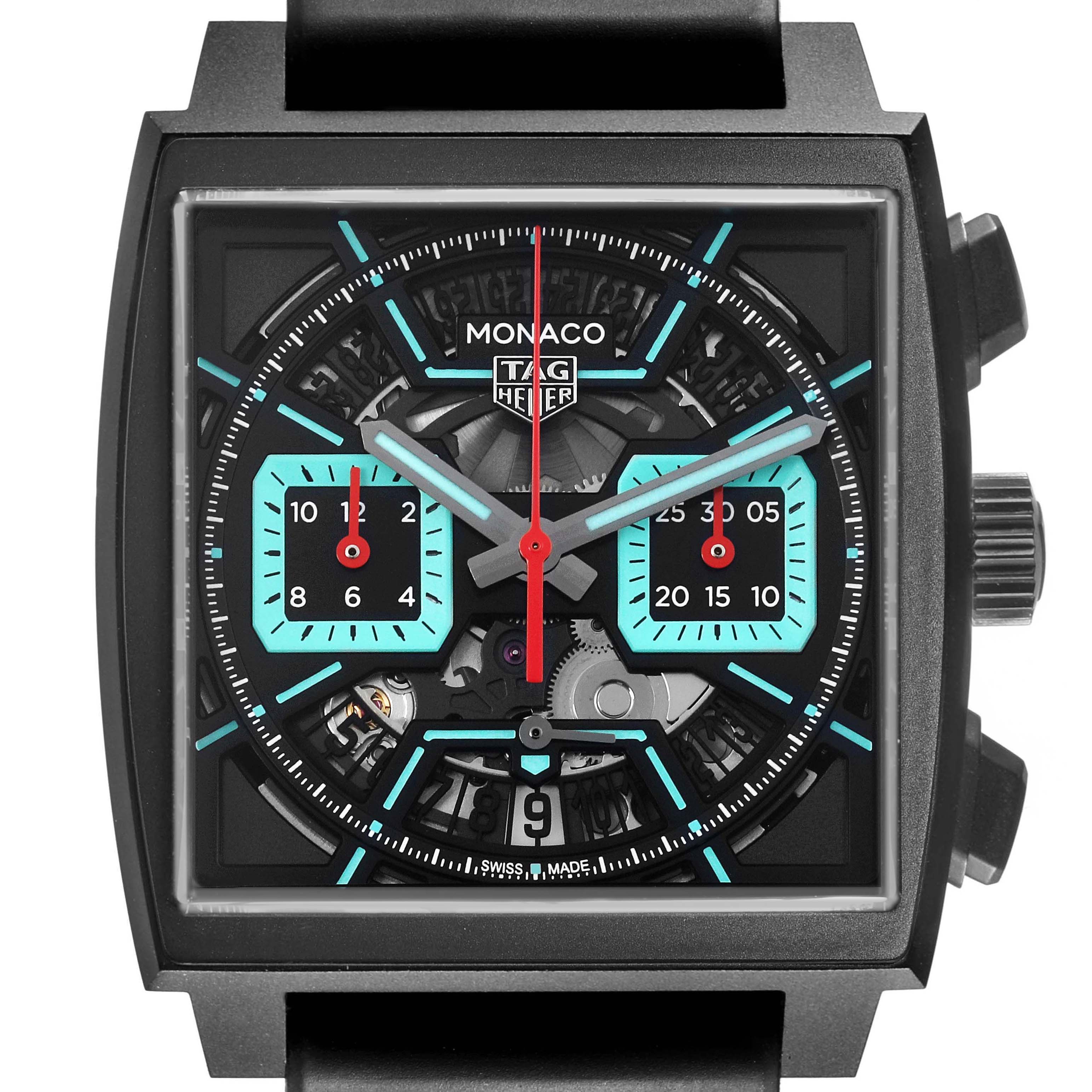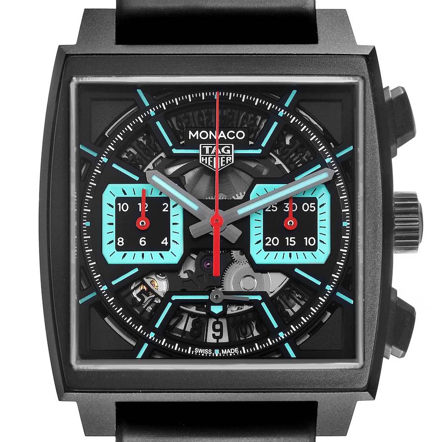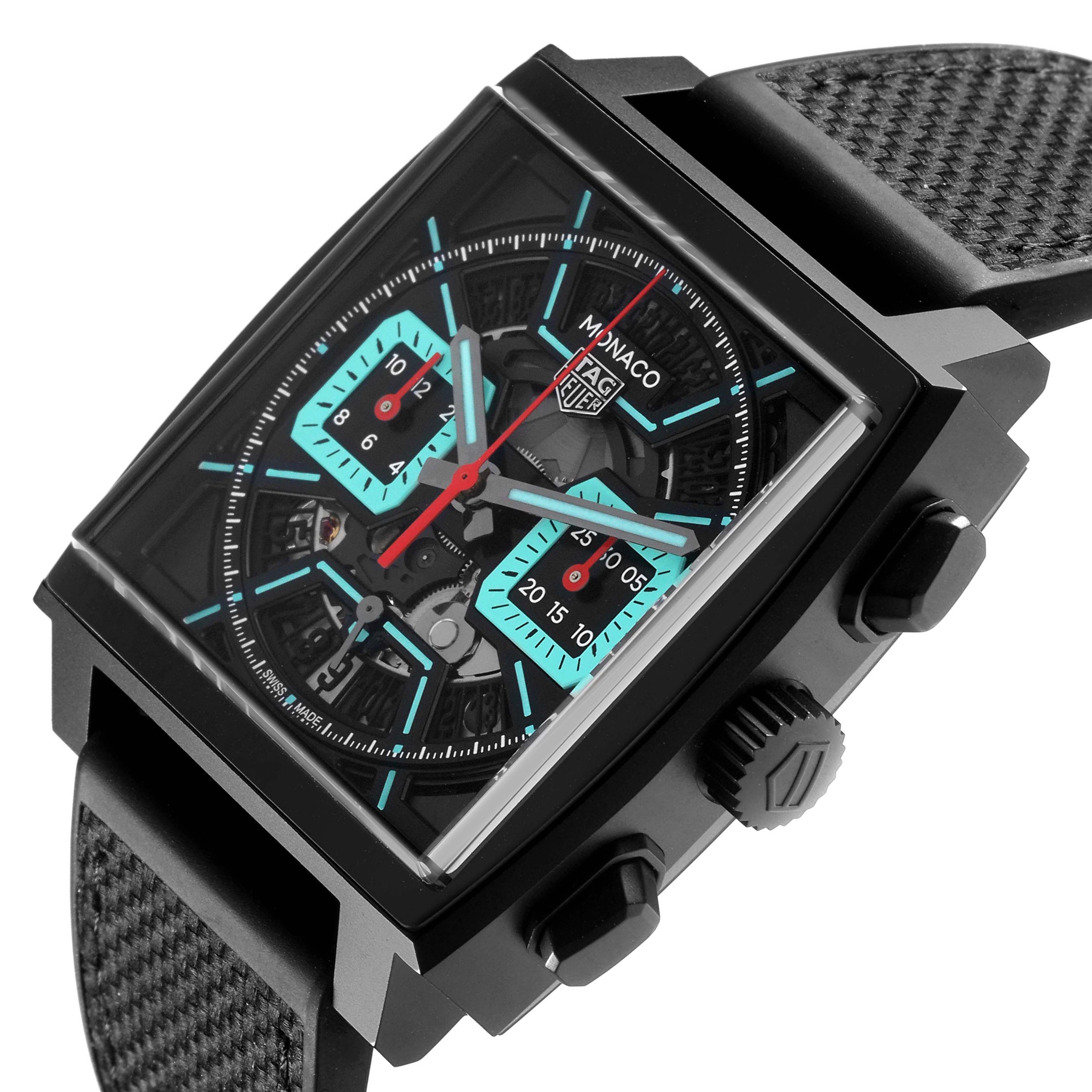 Tag Heuer Monaco Calibre 02 Black Dial Titanium Mens Watch CBL2184 Unworn. Automatic self-winding movement. DLC-coated titanium case 39.0 x 39.0 mm. Two pushers operate the chronograph functions. Fluted crown with the Tag Heuer logo. Transparent exhibition sapphire crystal case back. DLC-coated titanium smooth bezel. Scratch resistant sapphire crystal. Opalin black dial with luminescent turquoise index hour markers and hands. Date window and running seconds subdial at 6 o'clock. Two turquoise-outlined chronograph subdials -- 30 minutes at 3 o'clock and 12 hours at 9 o'clock. Black rubber and leather strap with a titanium double push-button deployant clasp.