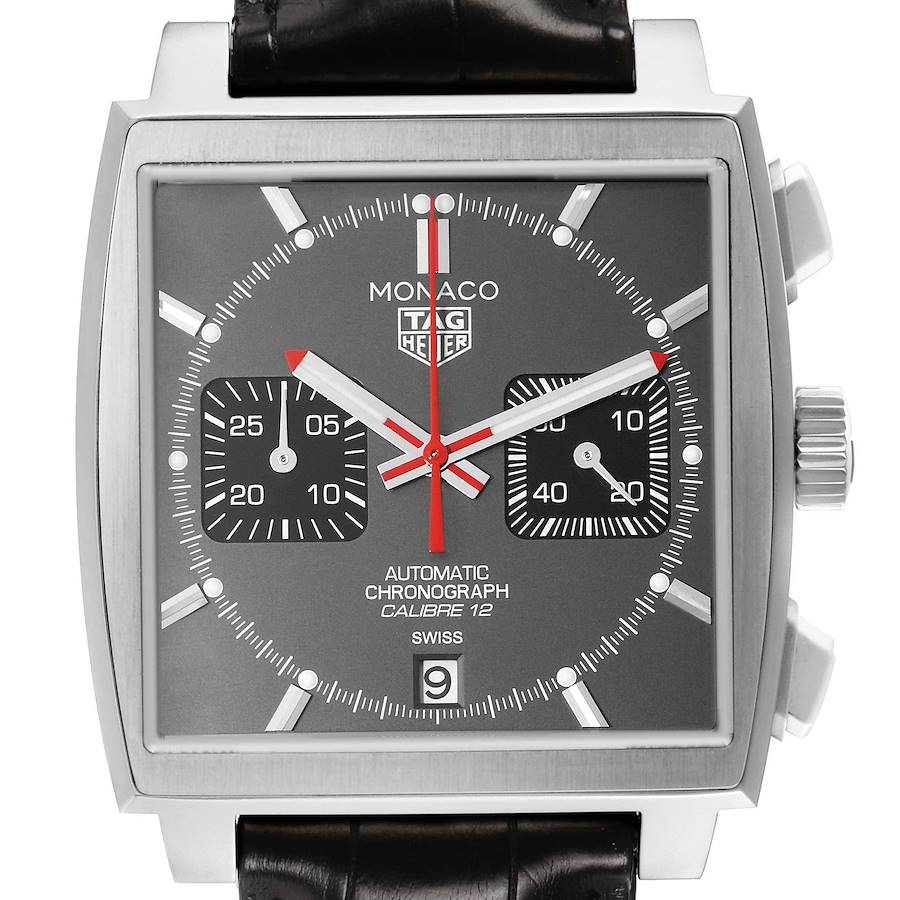 Tag Heuer Monaco Grey Dial Limited Edition Steel Mens Watch CAW211J Box Card. Automatic self-winding chronograph movement. Alternate fine-brushed and polished stainless steel case 39.0 x 39.0 mm. Fluted crown. Exhibition transparent sapphire crystal case back. Stainless steel bezel. Scratch resistant sapphire crystal. Grey dial with with red accents. Raised polished, nickel-plated index hour markers and luminous hands. Date window at 6. Two chronograph sub-dials -- 60 seconds and 30 minutes. Black leather strap with stainless steel deployant buckle.