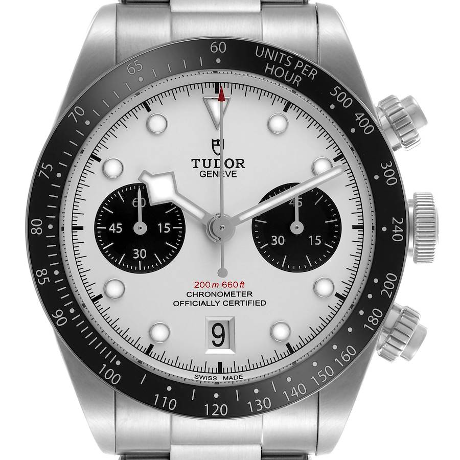 Tudor Black Bay Chronograph Panda Dial Steel Mens Watch 79360 Box Card. Automatic self-winding chronograph movement. Stainless steel oyster case 41.0 mm in diameter. Screw down stainless steel winding crown and chronograph pushers. Tudor logo on the crown. Stainless steel bezel with matte black aluminum disc insert with a tachymeter scale. Scratch resistant sapphire crystal. Opaline silver panda dial with luminescent hands and dot hour markers. Minute and 1/4-second markers around the outer rim. Two black subdials -- running small seconds and the 45-minute chronograph register. Date calendar at the 6 o'clock aperture. Stainless steel riveted bracelet with flip lock clasp. Fits up to an 8 3/4" wrist.
