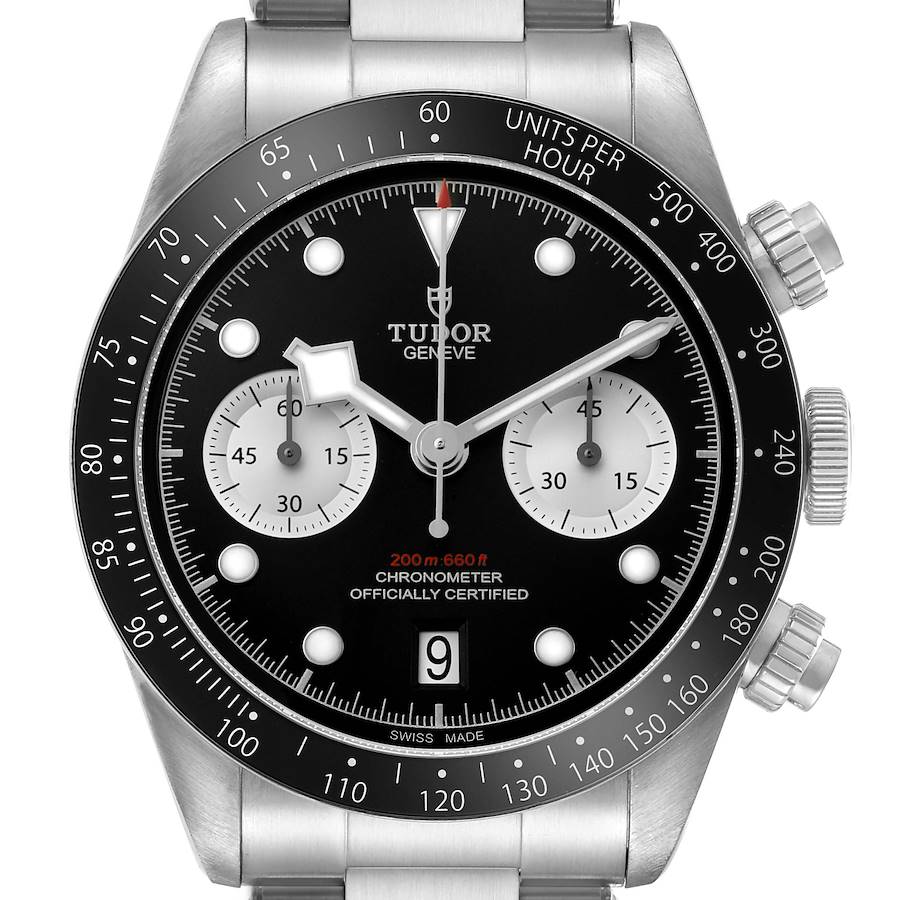 Tudor Black Bay Chronograph Reverse Panda Dial Steel Mens Watch 79360N Box Card. Automatic self-winding chronograph movement. Stainless steel oyster case 41.0 mm in diameter. Two pushers operate the chronograph functions. Tudor logo on the crown. Black bezel insert with tachymeter scale. Scratch resistant sapphire crystal. Black dial with luminescent hands and dot hour markers. Two silver chronograph subdials -- the 45-minute chronograph register, and running seconds. Date window at 6 o'clock. Stainless steel bracelet with a flip-lock clasp. Fits up to an 8.5" wrist.