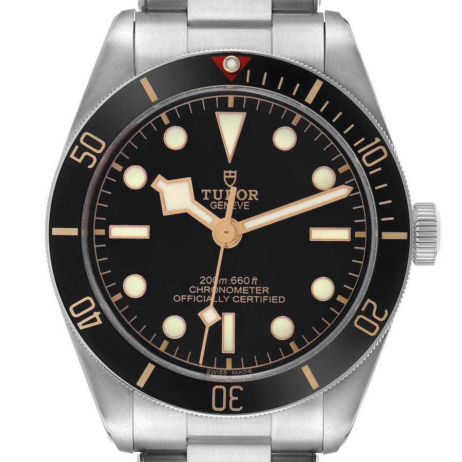 Tudor Black Bay Fifty Eight Black Dial Steel Mens Watch 79030 Card. Automatic officially certified chronometer self-winding movement. Stainless steel oyster case 39.0 mm in diameter. Tudor rose logo on the crown. Stainless steel unidirectional rotating time-lapse bezel with a black and gold aluminum insert. Scratch resistant sapphire crystal. Black dial with luminescent rose gold outlined snowflake hands and dot, baton, and triangle hour markers. Luminescent snowflake-tipped centre seconds hand. Outer stick minute markers. Stainless steel bracelet with a flip-lock clasp. Fits an 7.5" wrist.
