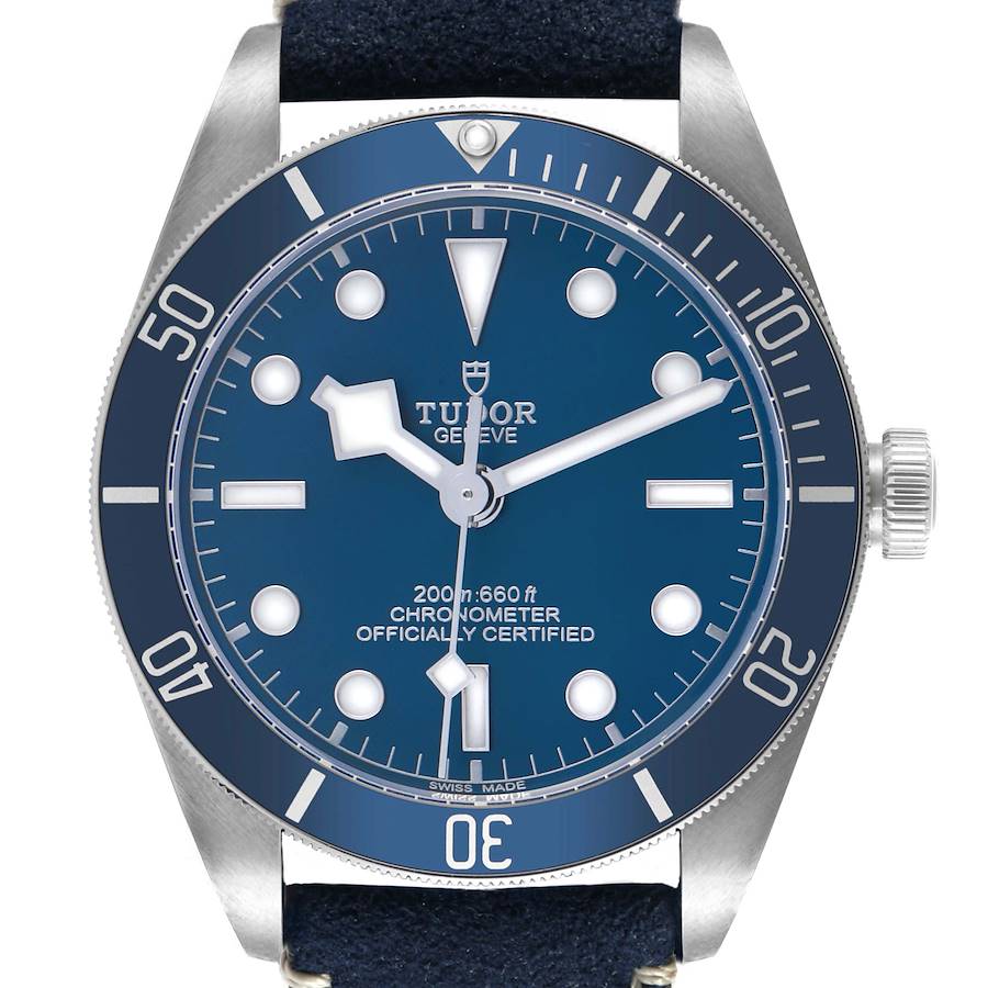 Tudor Black Bay Fifty-Eight Blue Dial Steel Mens Watch 79030 Box Card. Automatic self-winding movement. Stainless steel oyster case 39.0 mm in diameter. Tudor rose logo on the crown. Unidirectional rotating time-lapse stainless steel bezel with a matte blue insert showing 0-60 minute graduation. Scratch resistant sapphire crystal. Blue dial with luminescent snowflake hands and dot hour markers. Blue leather strap with flip-lock clasp.
