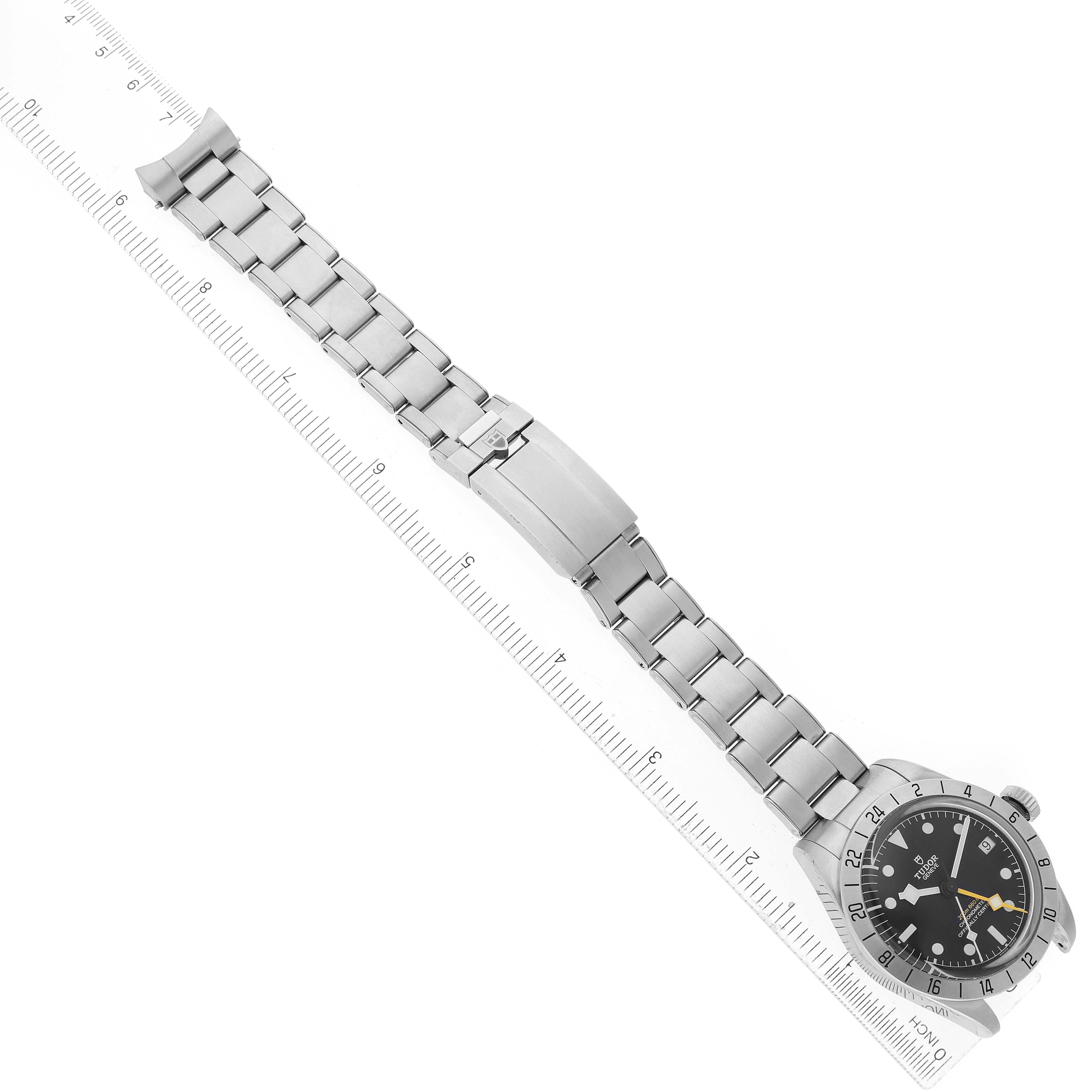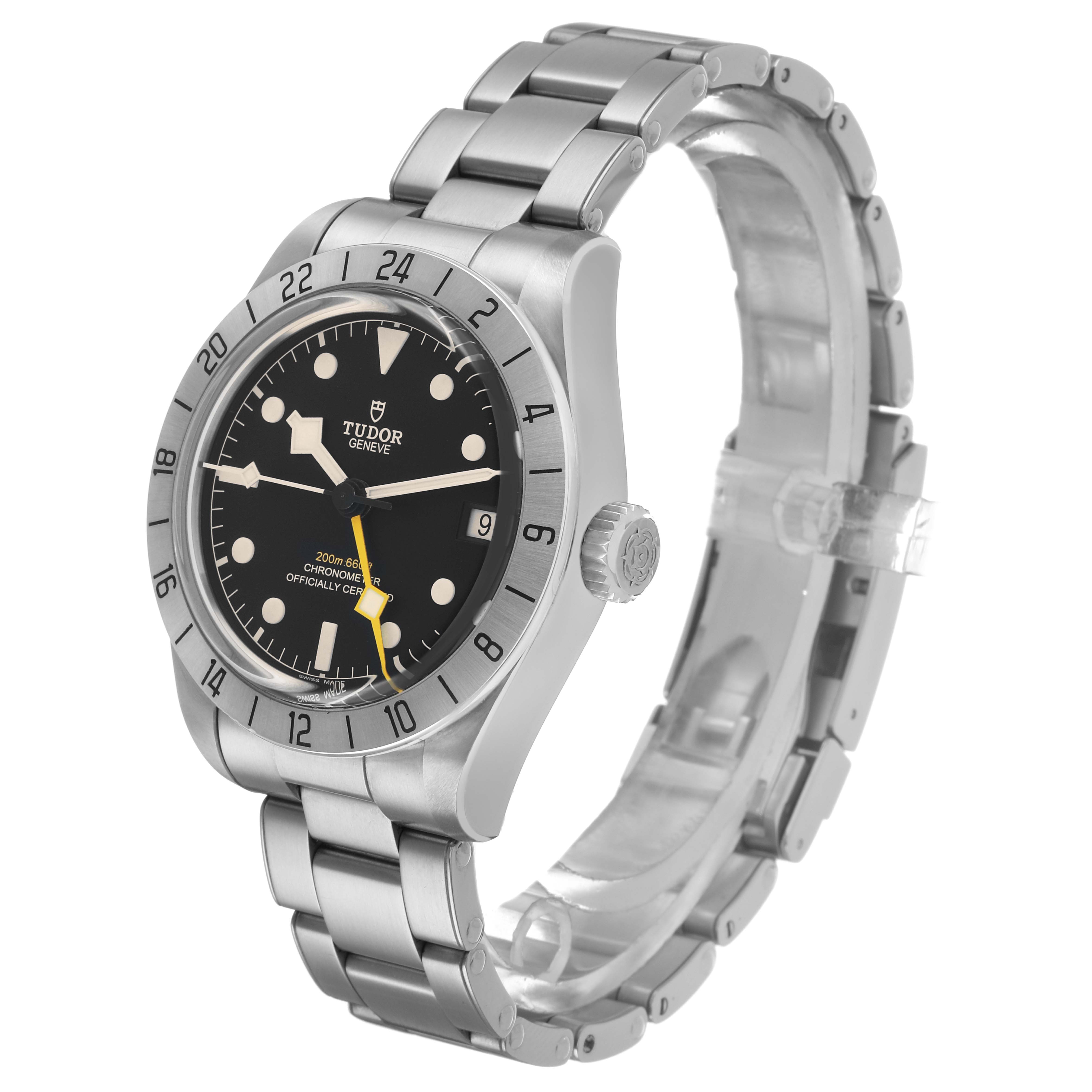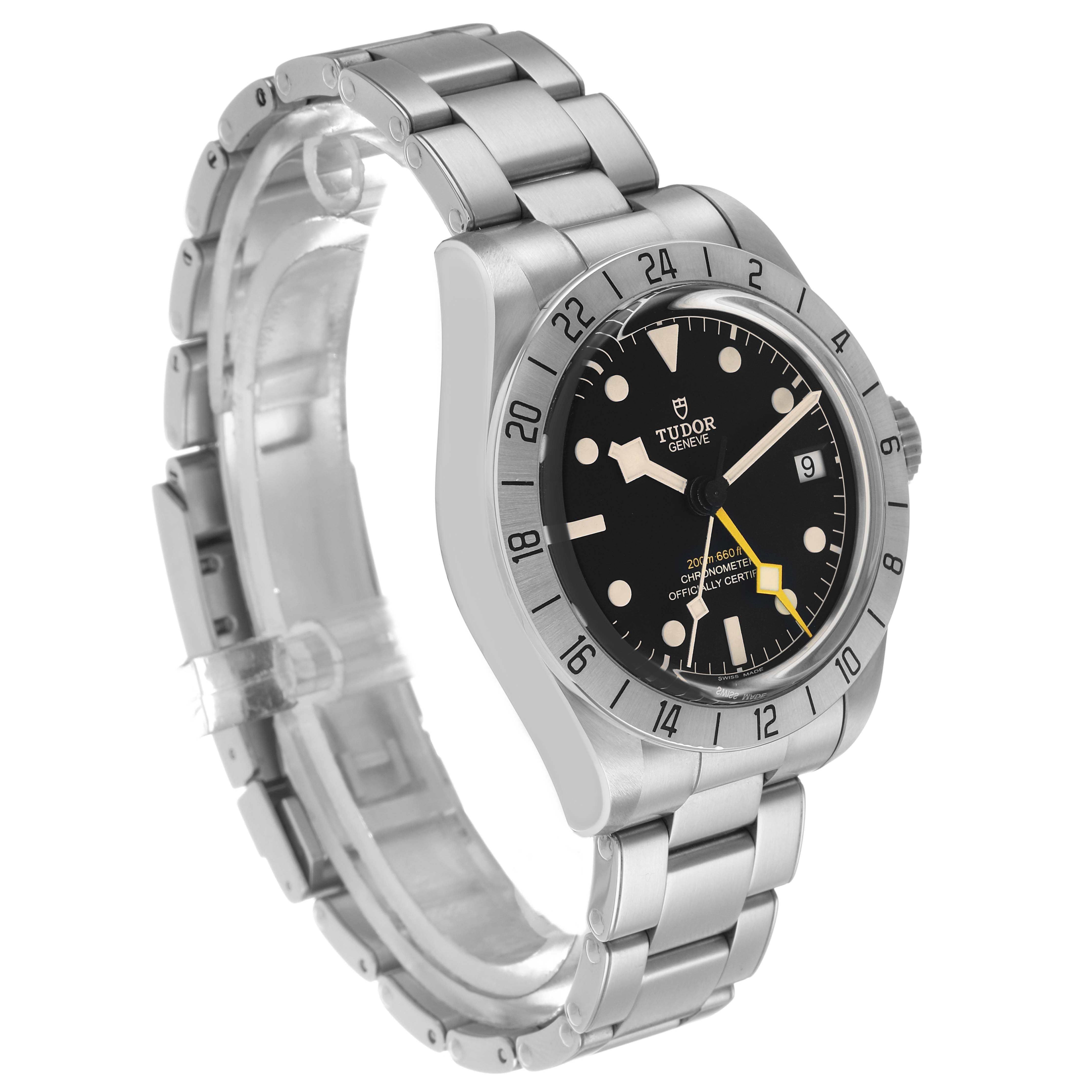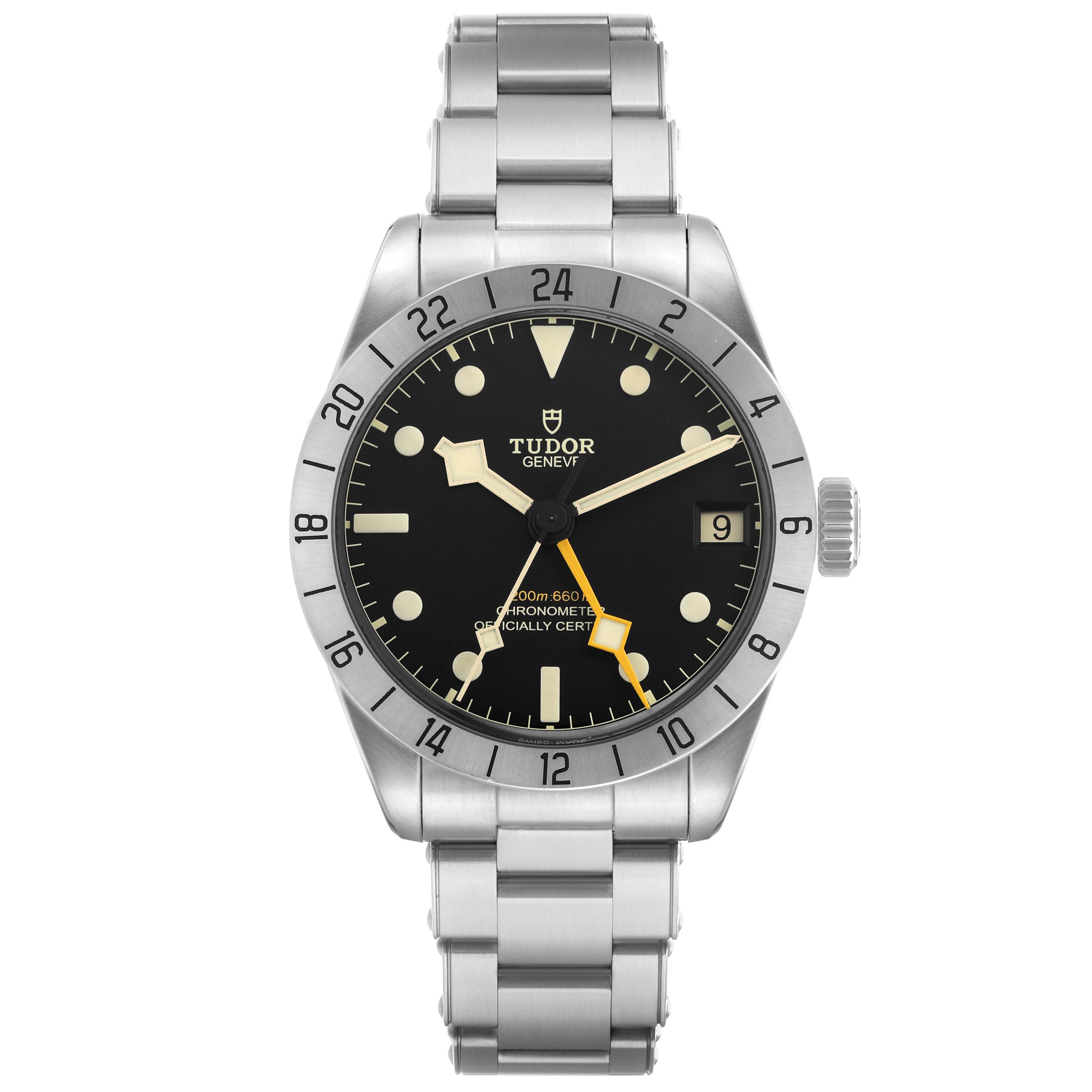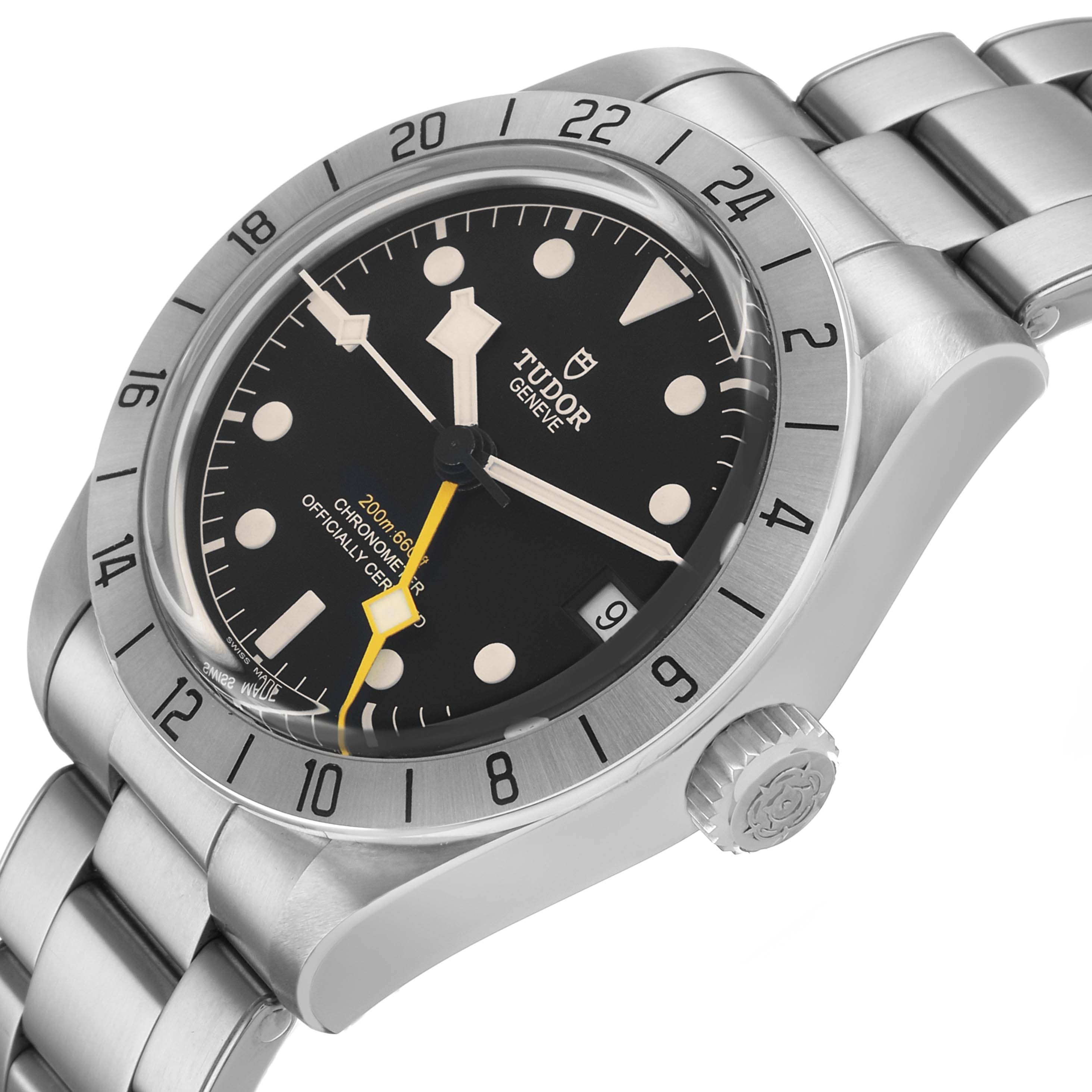 Tudor Black Bay Pro GMT Steel Mens Watch 79470 Box Card. Automatic self-winding movement. Stainless steel case 39.0 mm in diameter. Tudor rose on the screw down crown. Stainless steel 24-hour graduated bezel with satin finish. Scratch resistant sapphire crystal. Black dial with luminescent dot hour markers and snowflake-shaped hands. Yellow GMT hand. White luminescent snowflake-shaped sweeping seconds hand. Date window at 3 o'clock. Stainless steel bracelet with flip lock folding clasp. Fits an 8.5" wrist.