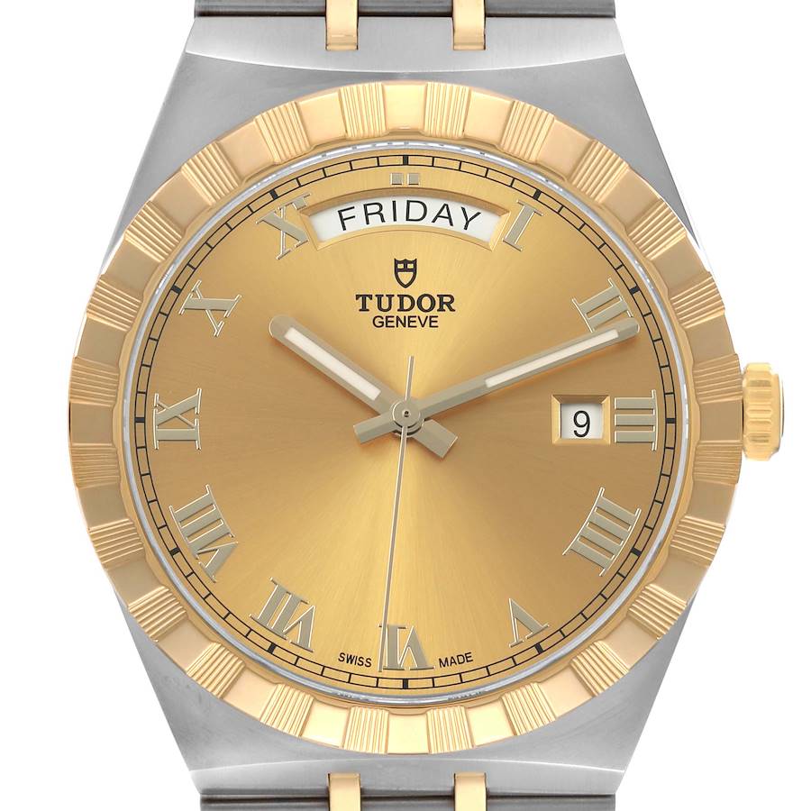 Tudor Royal Steel Yellow Gold Champagne Dial Mens Watch 28603 Box Card. Automatic self-winding movement. Stainless steel round case 41.0 mm in diameter. 18k yellow gold engine turned bezel. Scratch resistant sapphire crystal. Champagne dial with raised roman numerals and original Tudor diamond hour markers. Luminous inlay hands. Date window at 3 o'clock. Day of the week window at 12 o'clock. Stainless steel and yellow gold bracelet with deployant buckle. Fits 7 1/2" wrist.