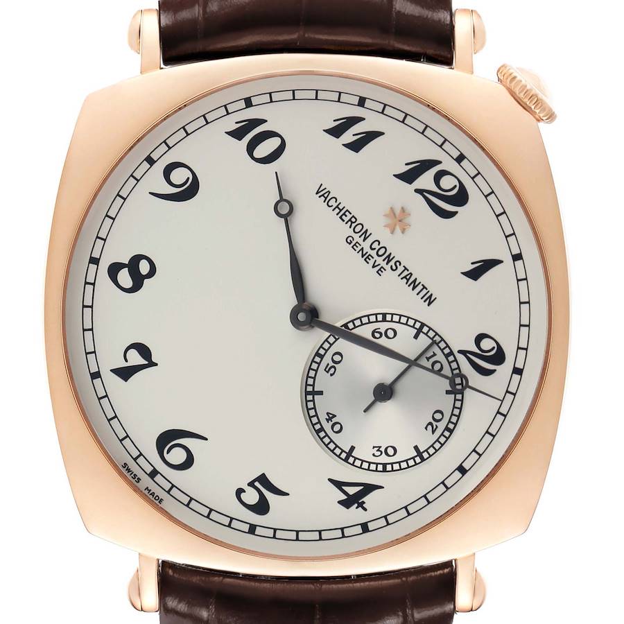 Vacheron Constantin Historiques American 1921 Rose Gold Mens Watch 82035. Manual winding movement. 18K rose gold case 40 x 40 mm. Case thickness: 8 mm. Transparent exhibition sapphire crystal case back. Vacheron Constantin logo on the 18k rose gold crown. 18K rose gold smooth bezel. Scratch resistant sapphire crystal. Grained silver-toned dial with breguet-style hands and Arabic numeral hour markers. Minute markers around the outer rim. Small seconds subdial at the 3 o'clock position. Brown leather strap with 18K rose gold tang buckle.