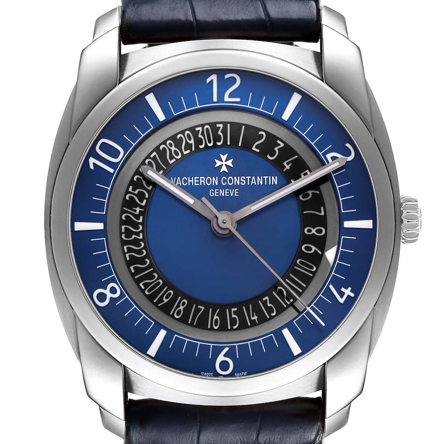 Vacheron Constantin Quai De L'ile Date Blue Dial Steel Mens Watch 4500S. Automatic self-winding movement. Stainless steel case 41 mm in diameter. Thickness 12.90 mm. Exhibition transparrent sapphire crystal case back. Stainless steel smooth bezel. Scratch resistant sapphire crystal. Blue dial with luminous hands and alternating Arabic numeral and index hour markers. Sapphire crystal date ring. Blue leather strap with stainless steel double deployant buckle.