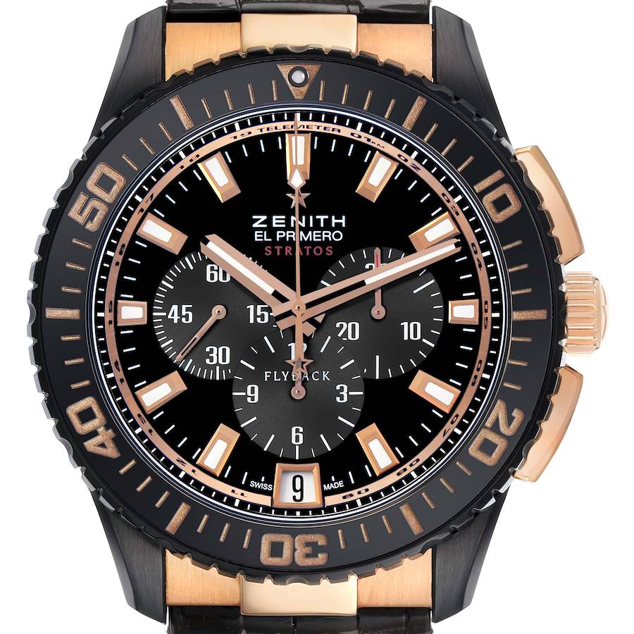 Zenith El Primero Stratos Flyback Chronograph Rose Gold Black Alchron Mens Watch 85.2060.405. In house Zenith El Primero self - winding automatic flyback chronograph movement. 45.5 mm 18k Rose Gold and Black Alchron (aluminum and titanium) case. 18k rose gold paddle style pushers at 2 and 4 o'clock. 18k rose gold screw down crown with Zenith star logo. 18k rose gold solid end links. Black Alchron exhibition transparent sapphire crystal case back with rose gold screws. Black ceramic unidirectional bezel. Rose gold Arabic numerals and full graduation. Rose gold triangle with luminating pip. Scratch resistant sapphire crystal. Glossy black dial with raised baton rose gold indices. Rose gold stick style hour and minute hands. Grey Subdials at 3, 6, and 9 o'clock for chronograph minutes and hours with running seconds accordingly. Stationary rose gold chronograph hand. Date aperture at 6 o'clock. Luminous hands and indices. Glossy black alligator leather strap. Black deployant clasp with twin button trigger for tang buckle side. Zenith star logo on buckle.